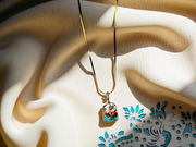This lovely chain from Ashi Creations features a smooth, anti-tarnish gold-toned chain with a unique square pendant. The pendant has a beautiful, hand-painted look with a white flower, hints of blue and orange, and a tiny pearl. It's a charming and artistic piece for everyday wear or to add a special touch to your look, staying shiny for a long time!