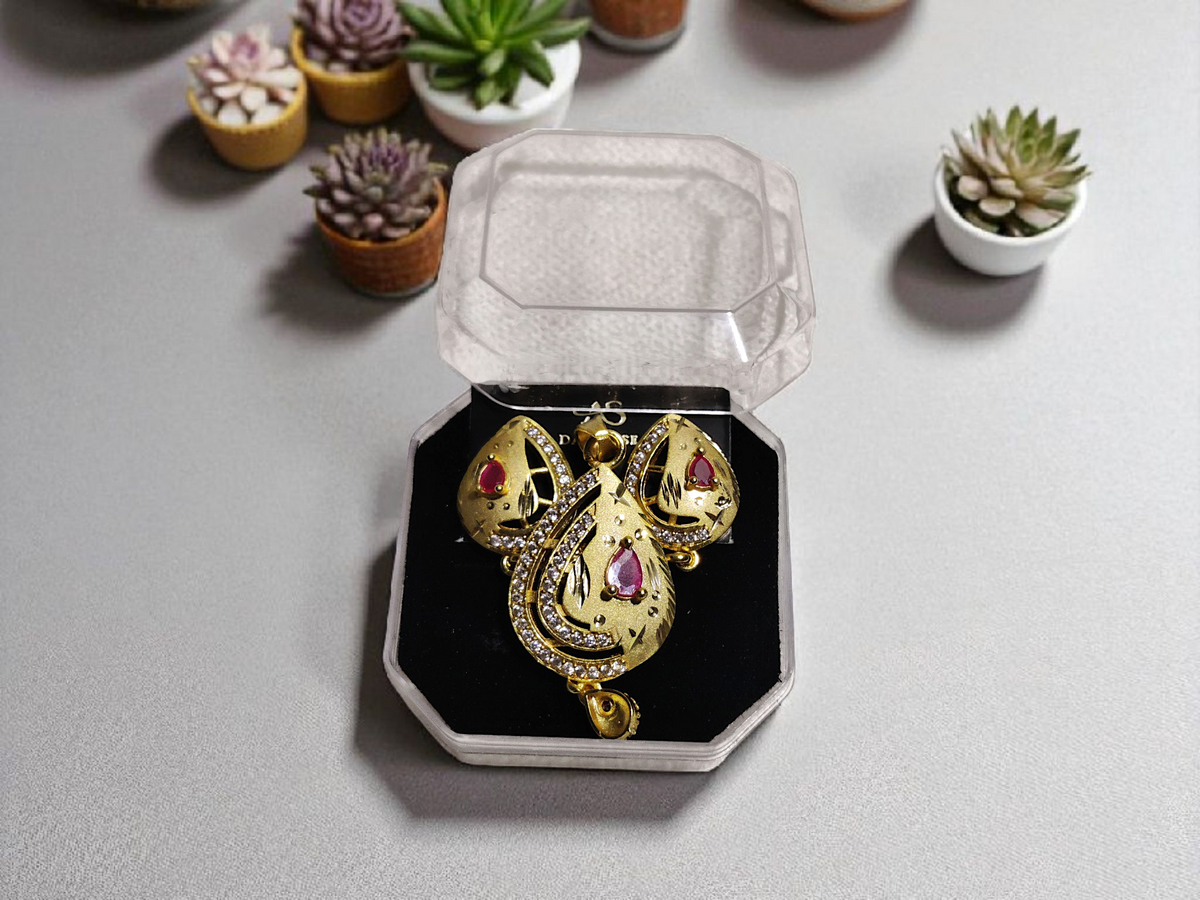 The Ashi Ruby Teardrop Pendant Set features an artistic paisley shape paired with classic teardrop accents, highlighted by deep ruby-toned stones and shimmering crystal borders. The rich gold-like finish adds a luxe touch, making it a perfect pick for ethnic outfits or evening events.