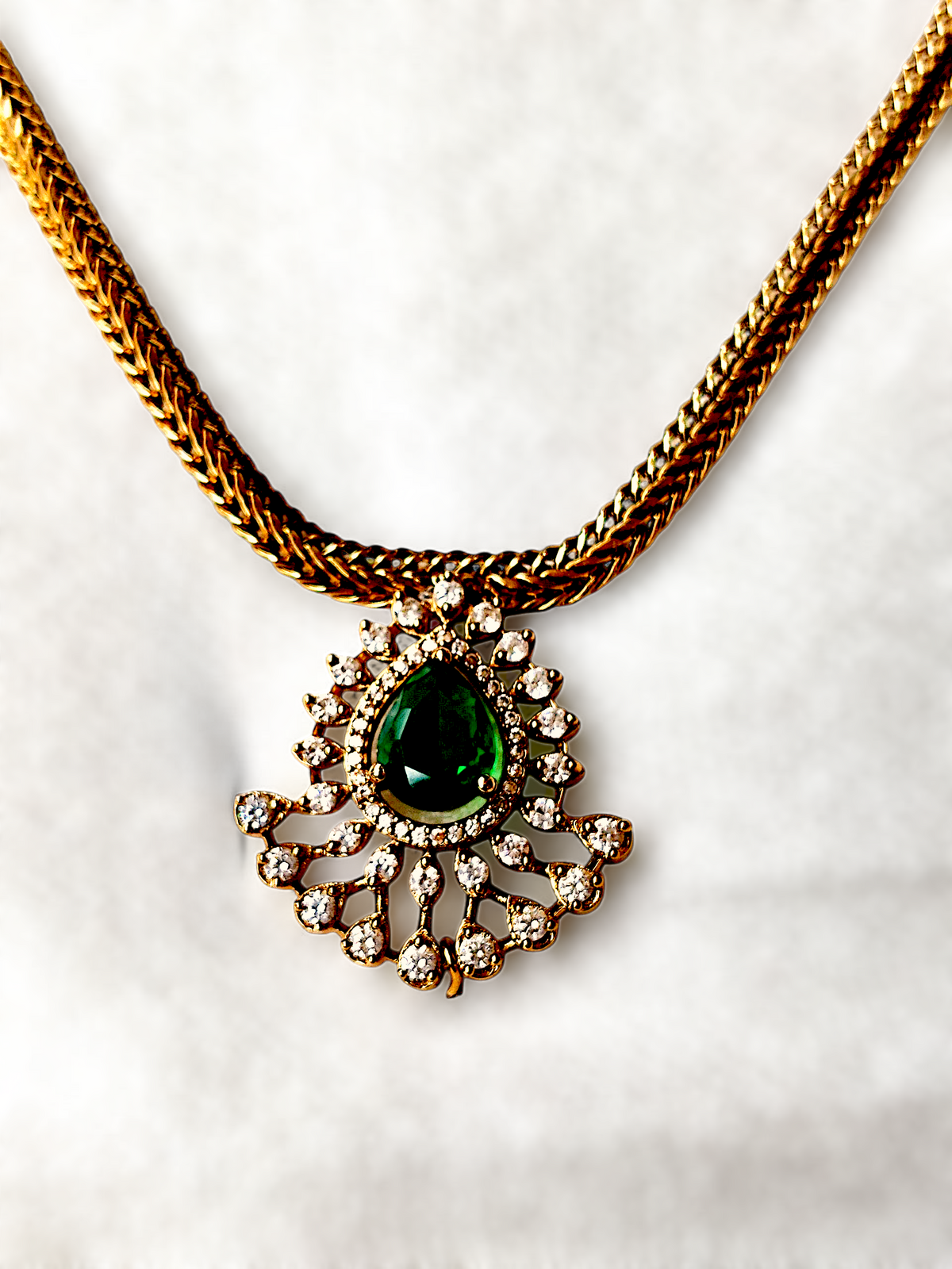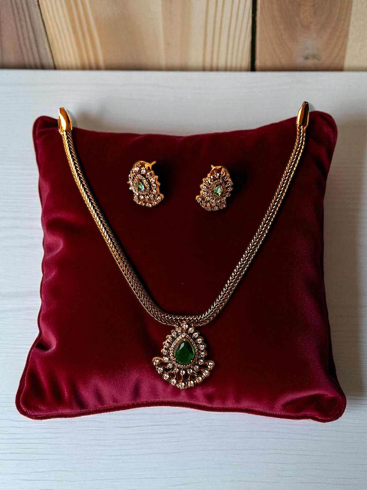 This elegant necklace set from Ashi Creations features a classic gold-toned chain with a stunning teardrop-shaped emerald green stone pendant,...
