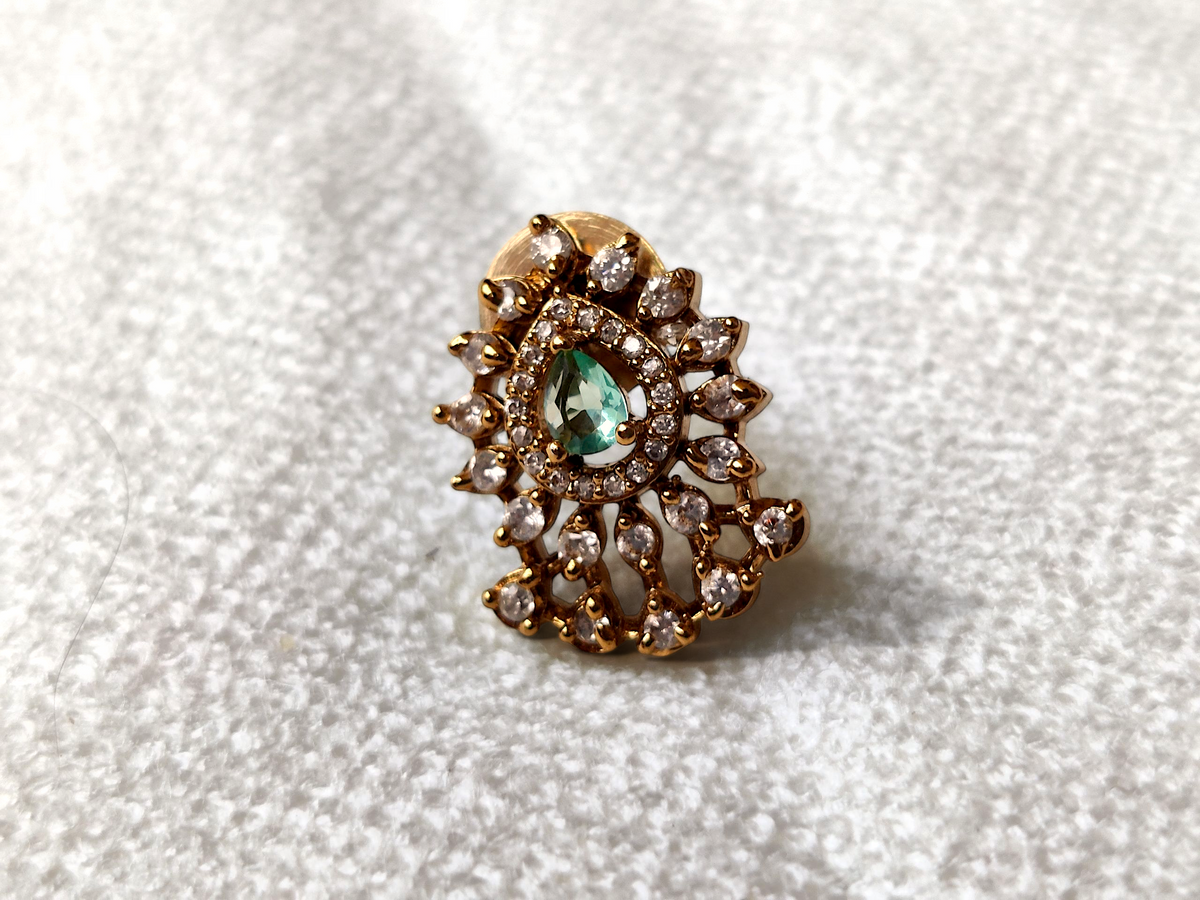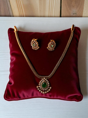 This elegant necklace set from Ashi Creations features a classic gold-toned chain with a stunning teardrop-shaped emerald green stone pendant, surrounded by sparkling white stones. It comes with matching stud earrings that echo the pendant's design. This set is perfect for everyday elegance or adding a subtle touch of color to your ethnic and fusion outfits.
