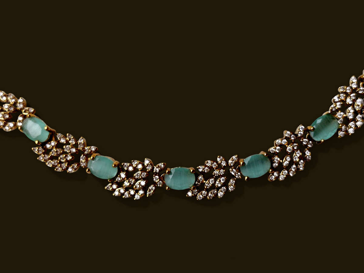 This beautiful necklace from Ashi Creations features charming mint green stones alternating with sparkling floral designs. It's a elegant piece that will add a touch of grace to your look.