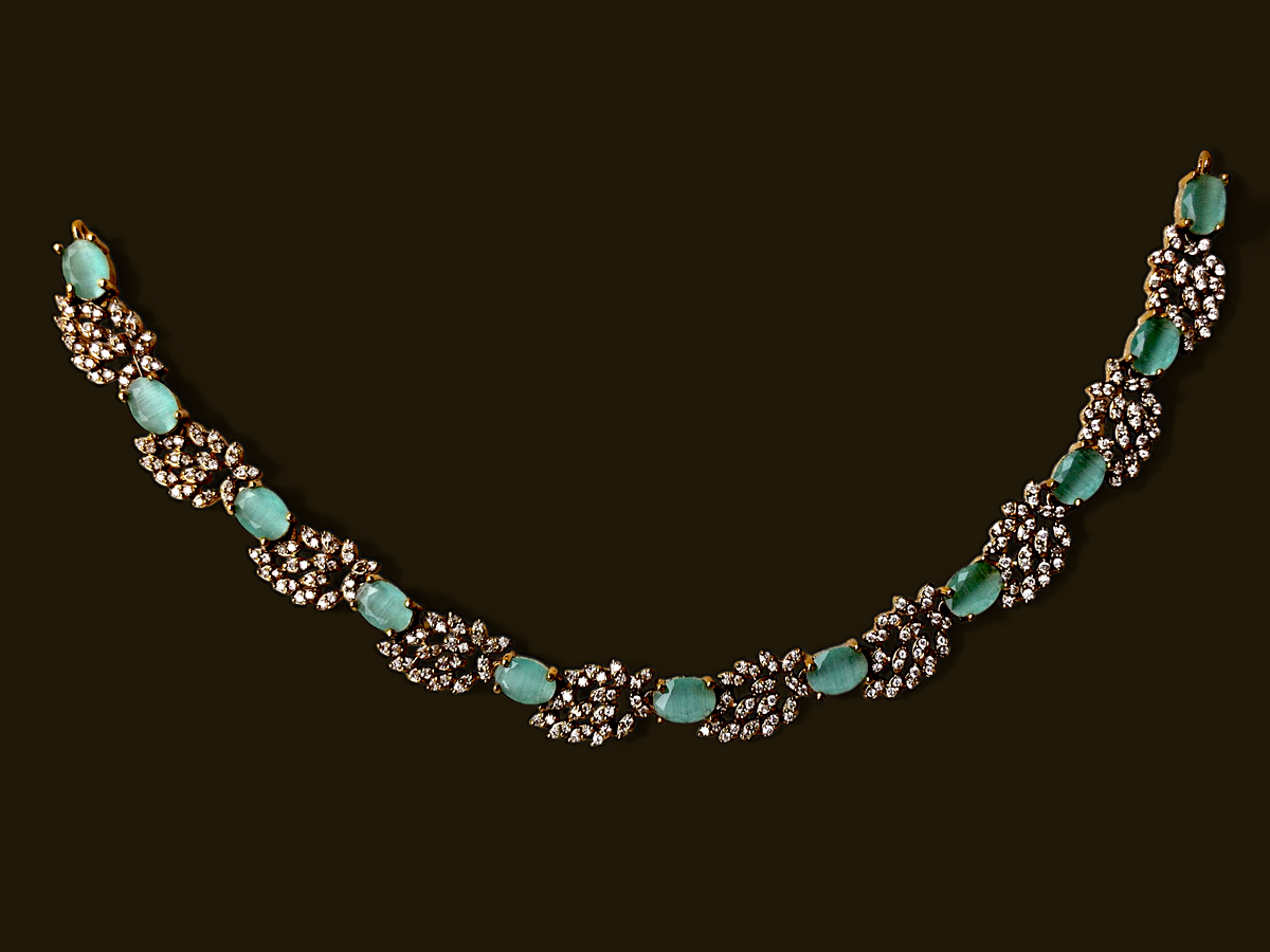 This beautiful necklace from Ashi Creations features charming mint green stones alternating with sparkling floral designs. It's a elegant piece...